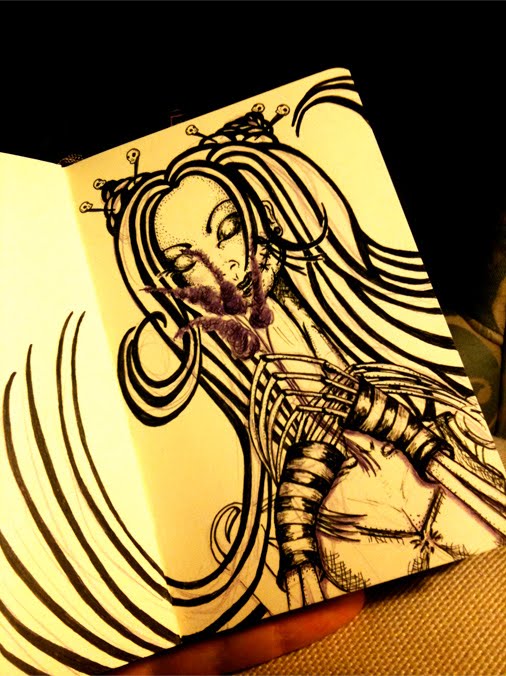 She's coming through...finals are over so I had a moment to sit down with my latest grrrl and begin inking her in...I hope she isn't too cross with me for neglecting her, but unfortunately final projects consumed most of my time the past weeks... By the look on her face, I think she's forgiven me...